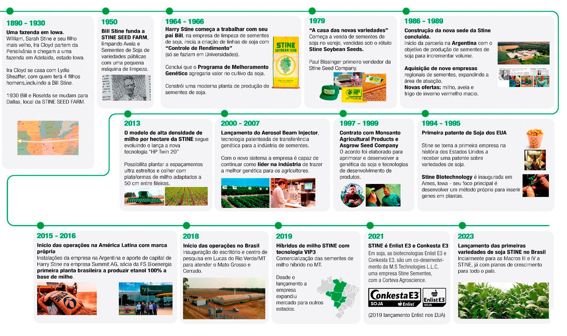 Com uma história que teve início há mais de 80 anos nos Estados Unidos, a Stine, empresa familiar criada e liderada por agricultores, chega ao Brasil, com a responsabilidade de seguir os passos do seu CEO, Harry Stine, oferecendo sementes de milho e soja ao produtor brasileiro, com uma missão de buscar constantemente, produtos que ofereçam a cada safra, mais Produtividade, Estabilidade e Qualidade ao agricultor.